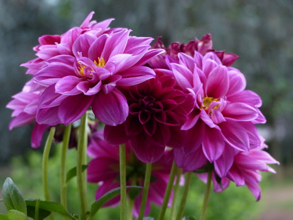 Dahlias offer a wide range of flower types. There are flowers shaped like pom-poms, anemones, cactus, orchids, and water lilies. The flowers come with single or double petals and in almost any color of the rainbow from white to purple. Some varieties produce flowers the size of a dinner plate, while others have small flowers on dwarf plants.